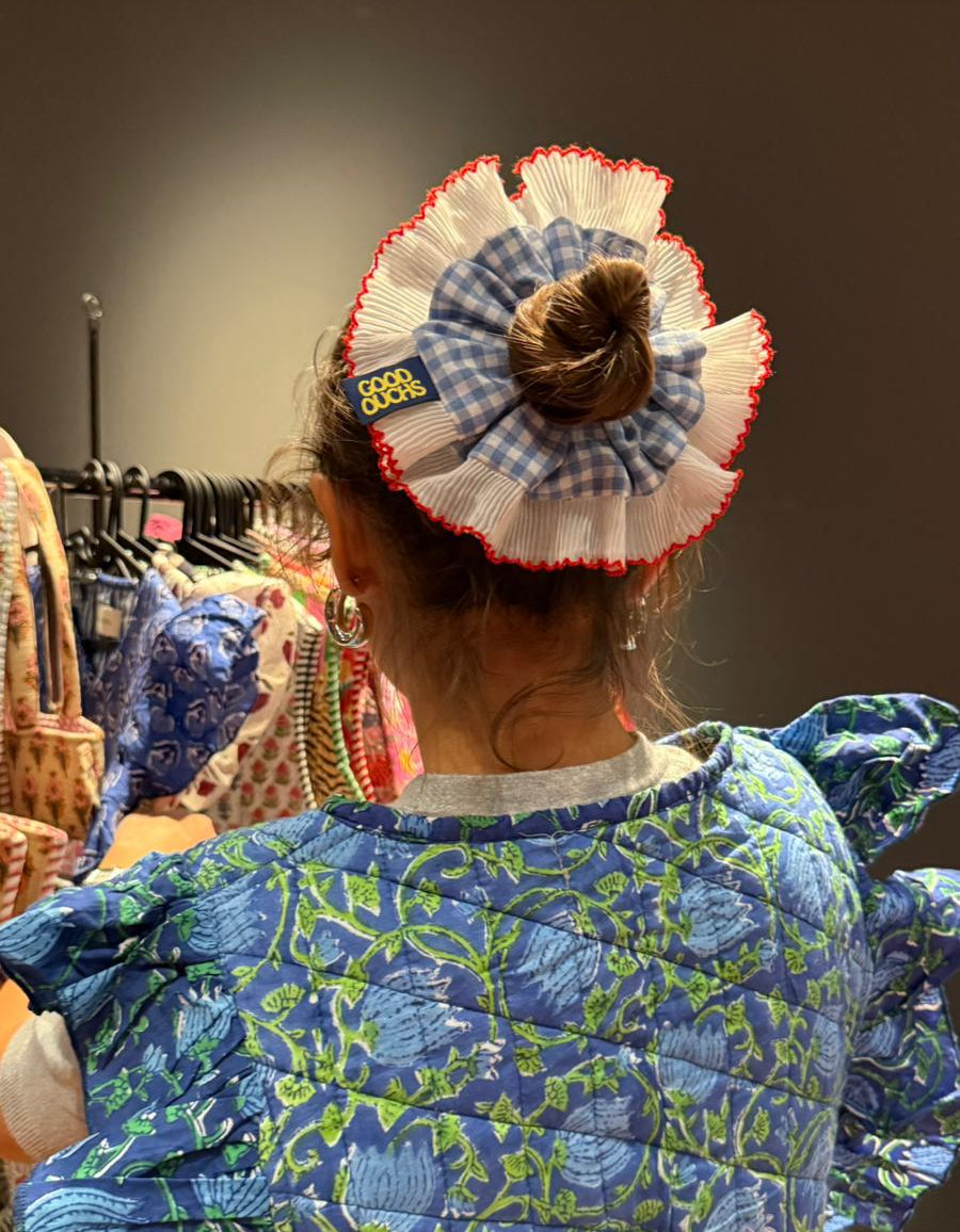* Mavi-beyaz gingham dokusu, kırmızı kenar detaylarıyla birleşerek klasik Fransız romantizmini modern bir formda taşıyor.